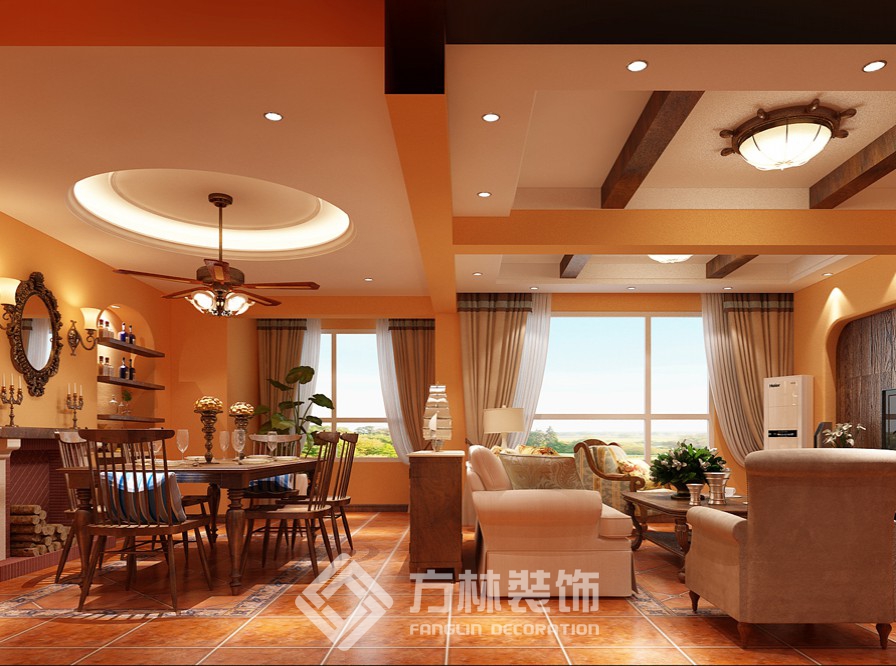 設(shè)計理念:整個空間以深咖色木質(zhì)材質(zhì)的家具為主,客廳墻上的裝飾鏡和配以棉麻的布藝更給人呈現(xiàn)出溫馨效果,使得整個空間既給人以厚重的感覺, 也給人比較溫馨、舒適的氛圍。 陳設(shè)主色調(diào): 以橙紅色、深咖色為底色,以米白色為點綴色。